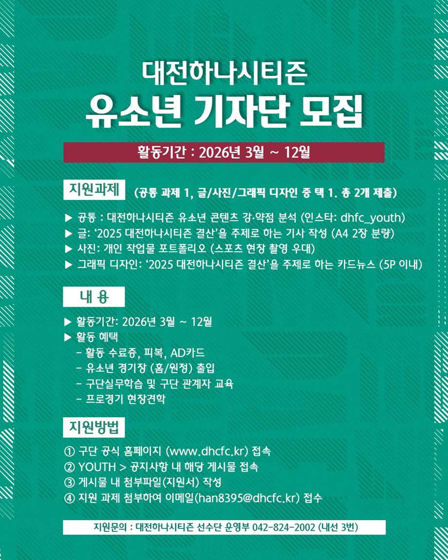 대전하나시티즌이 구단의 미래 유소년들의 이야기를 전달할 기자단을 모집합니다.