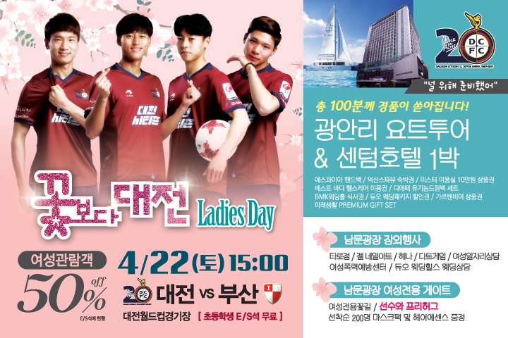 대전시티즌이 오는 22일(토) 오후 3시 대전월드컵경기장에서 열리는 ‘KEB 하나은행 K리그 챌린지 2017’ 부산아이파크와의 경기에서 ‘꽃보다 대전 레이디스 데이’를 개최한다.