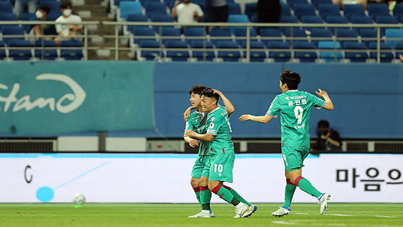 대전이 전반 종료 직전 선수 교체를 단행했다. 전반 43분 김민덕을 대신해 이진현을 투입했다. 곧바로 결정적인 기회가 찾아왔다. 전반 44분 레안드로가 좌측면에서 크로스를 올렸고, 이를 김승섭이 슈팅으로 연결했다. 수비 맞고 흐른 공을 쇄도하던 임은수가 강력한 왼발 슈팅으로 마무리했지만 골키퍼 선방에 막혔다.