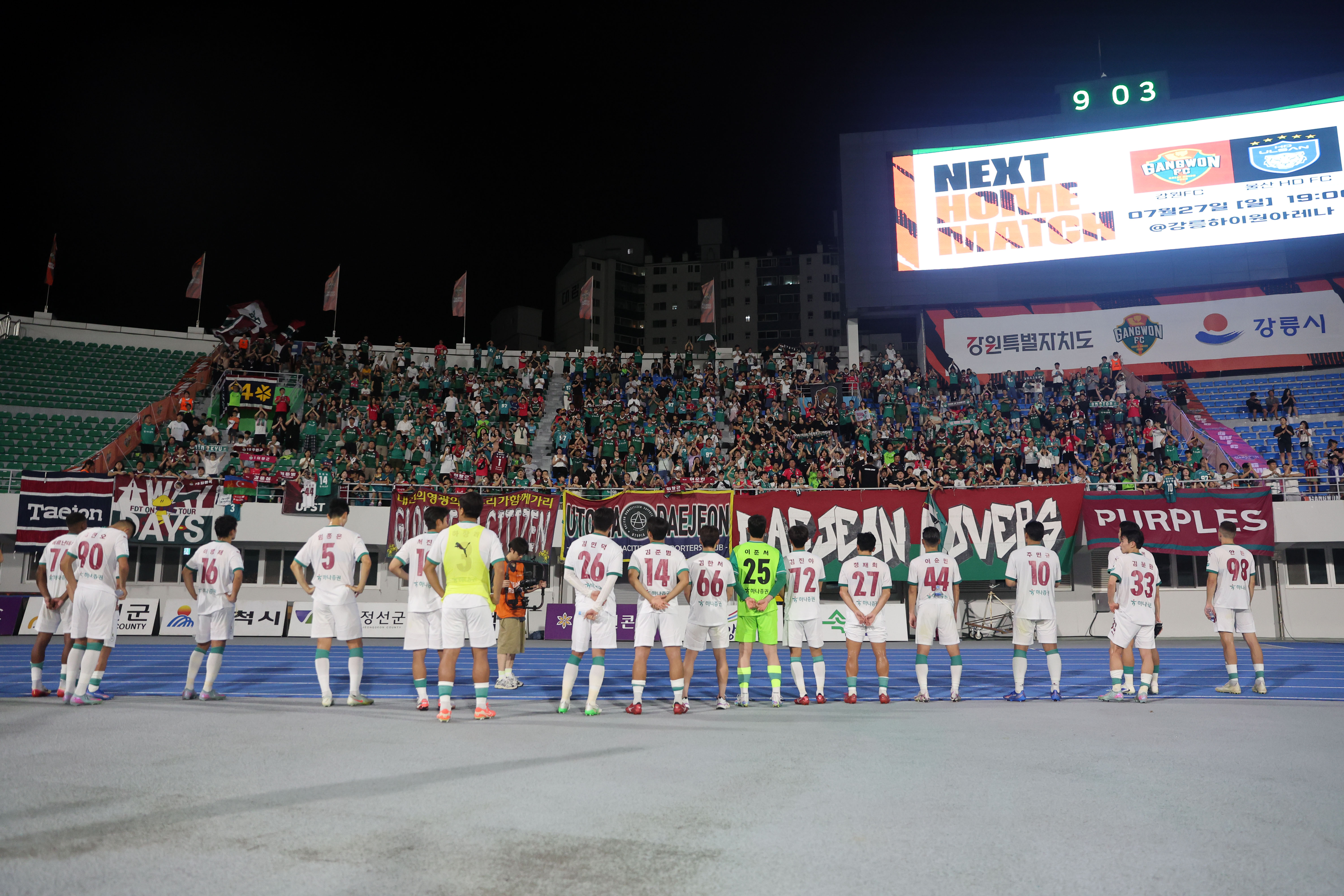 대전하나시티즌은 19일 오후 7시 강릉하이원아레나에서 열린 '하나은행 K리그1 2025' 22라운드에서 강원FC와 2-2로 비겼다. 5경기 연속 무승부를 거둔 대전은 2위에 올랐다.