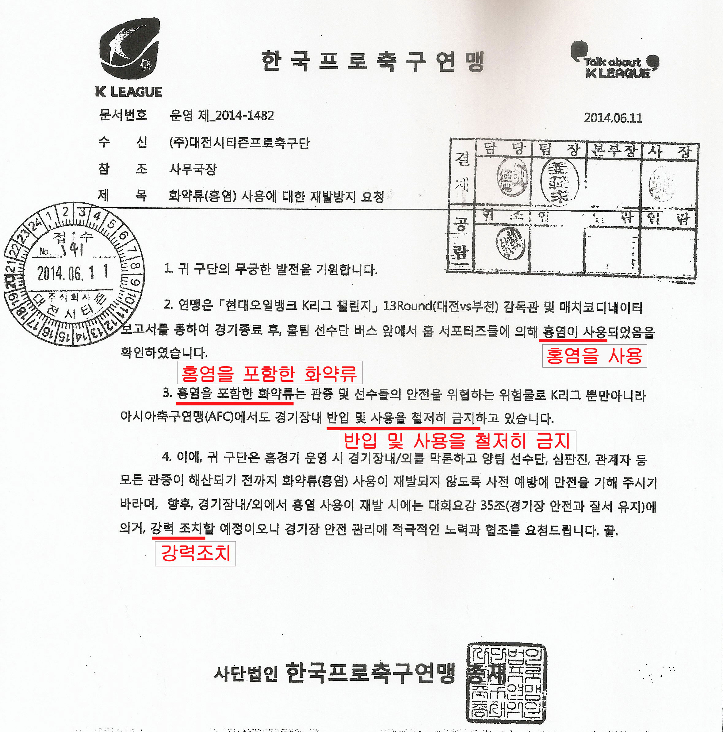 지난 6월 7일(토) '현대오일뱅크 K리그 챌린지‘ 13라운드 부천과의 경기 종료 후, 화약류(홍염) 사용에 대한 연맹이 전달해온 공문입니다. 추후 재발 시 벌금 등의 강력 조치가 예상되오니 이에 팬 여러분께 사용 자제의 글을 드립니다.