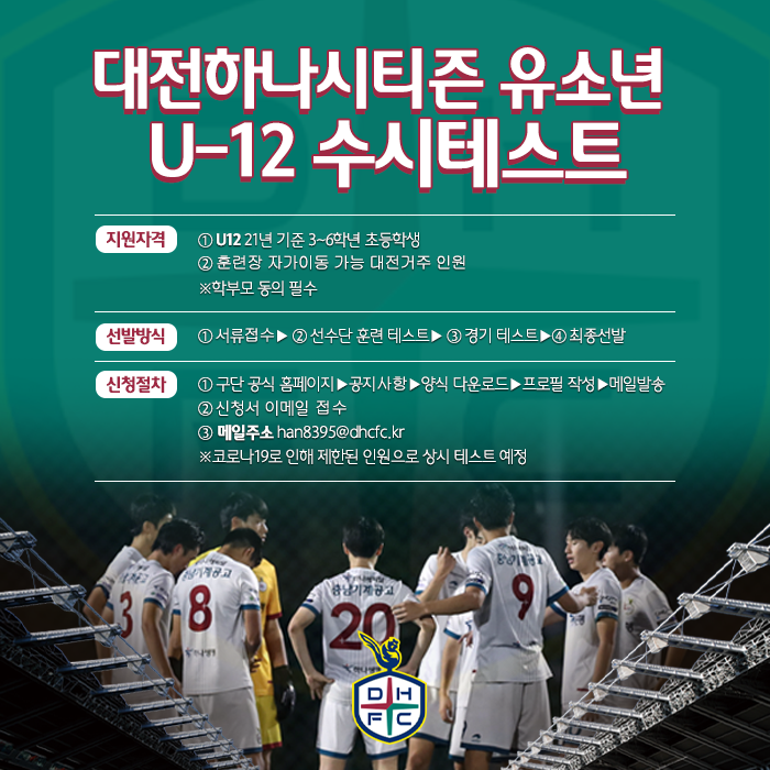 대전하나시티즌은 지역 내 축구 꿈나무들을 대상으로 '대전하나시티즌 U-12 육성반 수시 테스트'를 실시합니다.