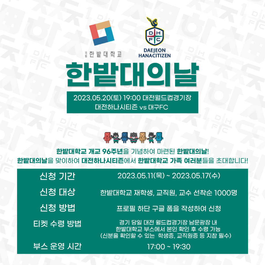 티켓 수령 방법 : 경기 당일 대전월드컵경기장 남문광장 내 한밭대학교 부스에서 본인 확인 후 수령 가능 (신분을 확인할 수 있는 학생증, 교직원증 등 지참 필수)