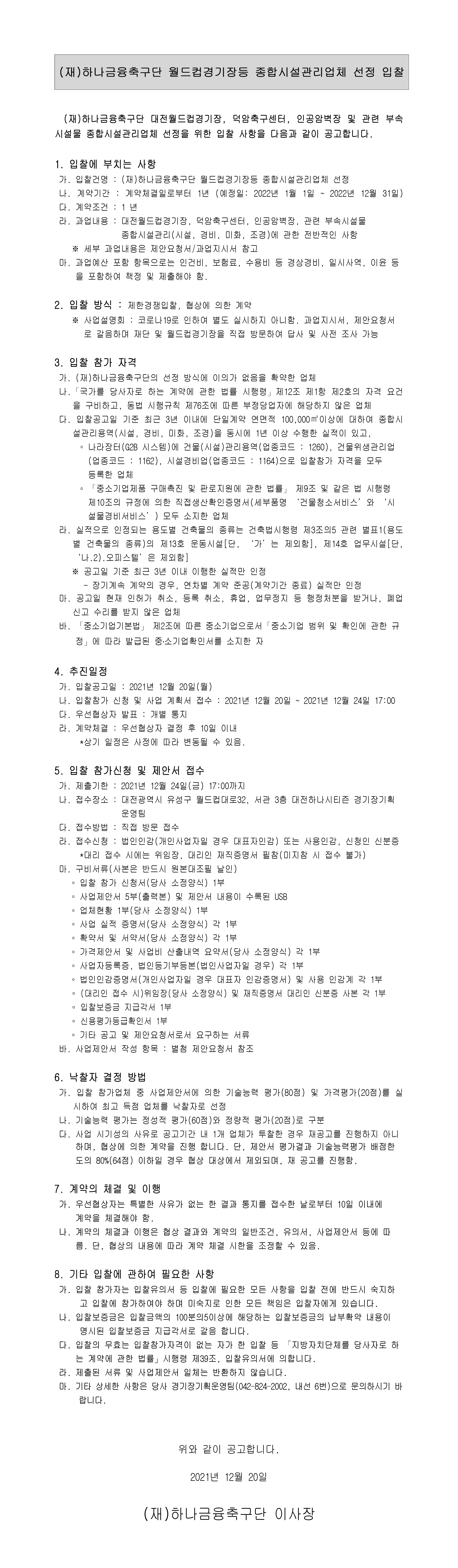 [입찰공고] (재)하나금융축구단 월드컵경기장 등 종합시설관리업체 선정