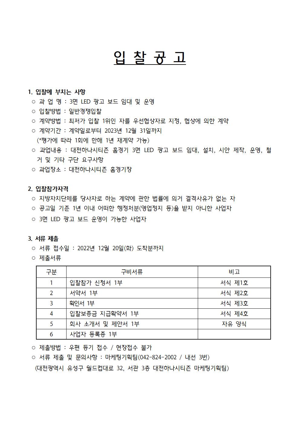 [입찰공고] (재)하나금융축구단 홈경기 3면 LED 광고 보드 임대 및 운영