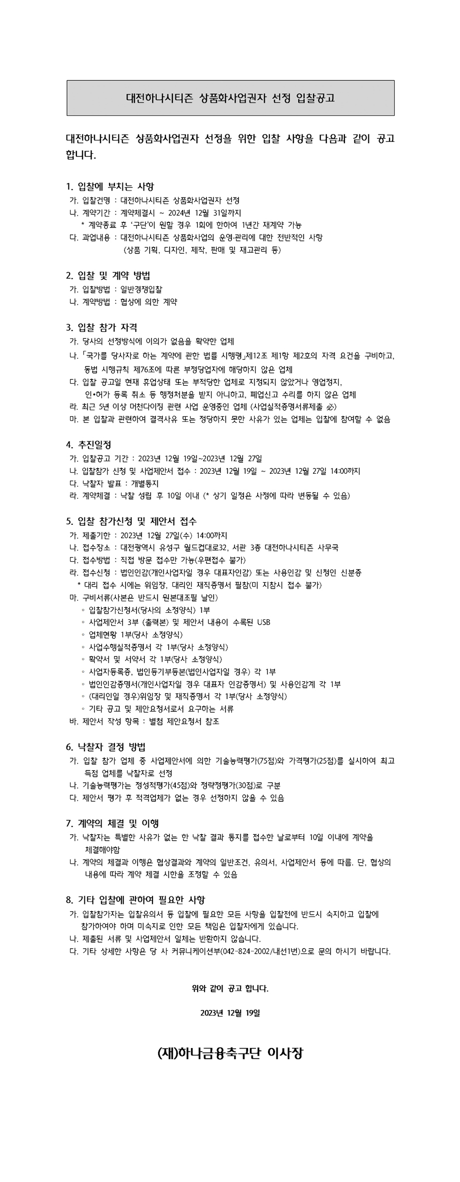 [입찰공고] 대전하나시티즌 상품화사업권자 선정