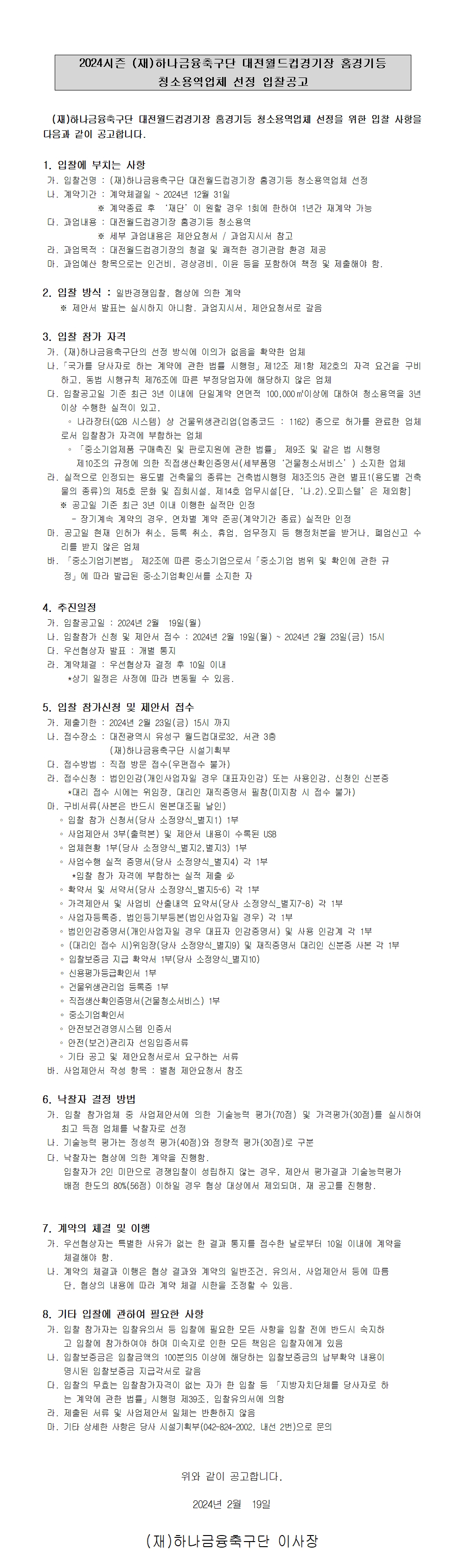 [입찰공고] 대전월드컵경기장 홈경기 등 청소용역업체 선정