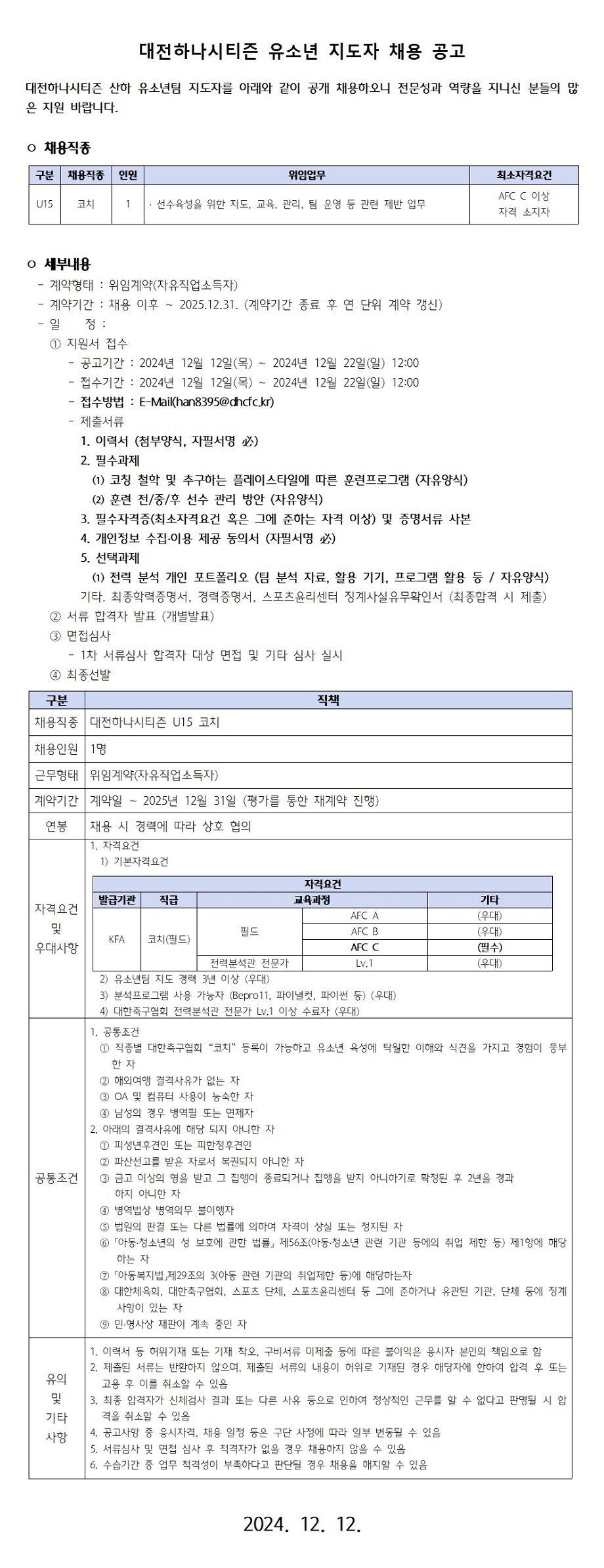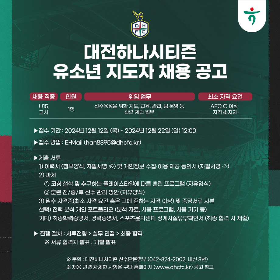 대전하나시티즌 유소년 지도자 채용 공고 (U15 코치)